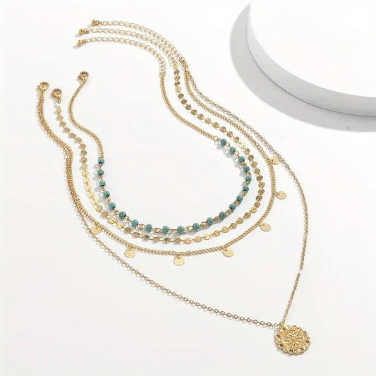 14k Gold Plated 3-Piece Bohemian Vintage Turquoise and Golden Sequin Layered Necklace Set
