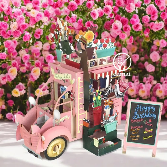 3D Pop-Up Pink Flower Cart Birthday Card,